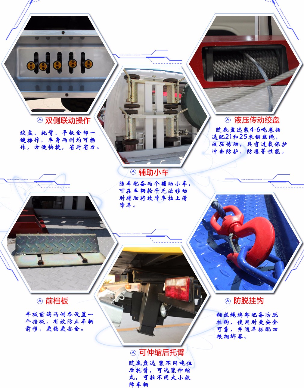 上裝配置:平板采用3P2A沖壓鋼板,具有更加出眾的平衡性,平板長4.2米,寬2.3米。背3噸,拖3噸。多路閥平衡閥采用意大利原裝(海德)進口;液壓缸佛山(海戰力)采用德國技術,雙層鋼絲液壓膠管,全進口密封圈。分體模壓拼焊面板,耐磨、防滑抗阻力強。雙側聯動操作系統,后工作燈2只,一個4噸液壓絞盤(25米鋼絲繩)一個洗手箱,2個小車,L型抱胎架1對,4根捆綁帶,后隱藏液壓伸縮式尾板,或尾部翻轉(可定做中間加長0.5米),可伸出長度為1.1米,應對較長車型的SUV和越野車型。上裝所有液壓元件均采用進口部件,可選裝國產件。