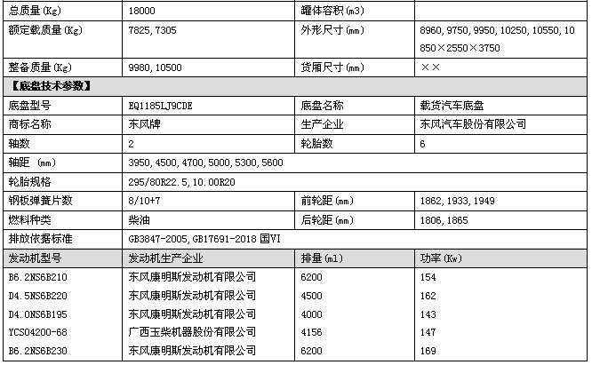 采用東風(fēng)公司原裝底盤,國(guó)六排放標(biāo)準(zhǔn),康明斯210馬力發(fā)動(dòng)機(jī),4700mm軸距,275真空胎,空調(diào),電動(dòng)玻璃,前橋4.5噸,后橋9噸,東風(fēng)6檔變速箱